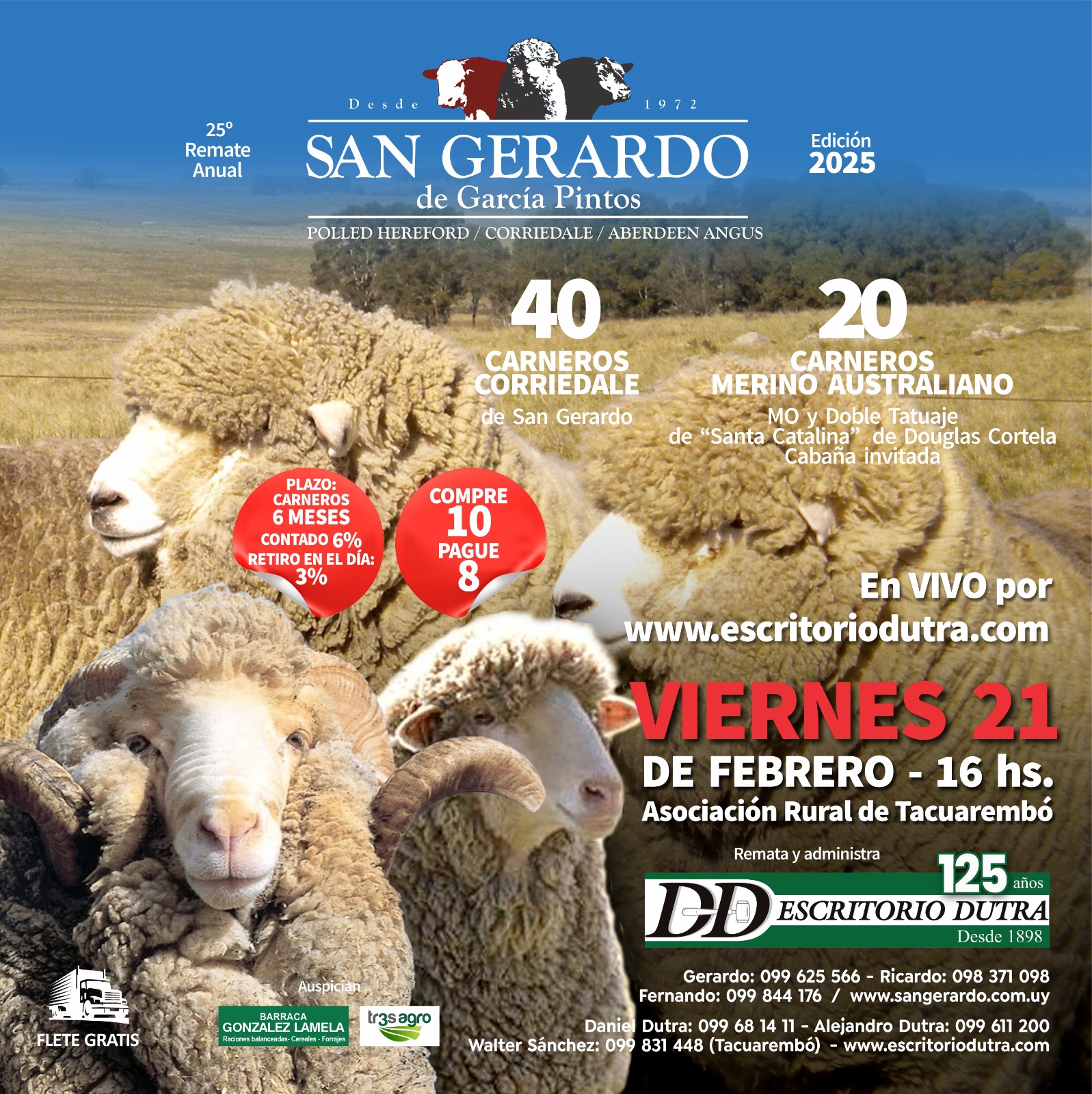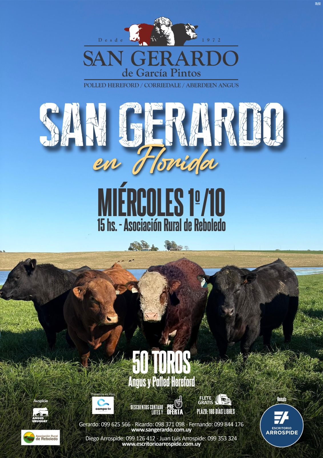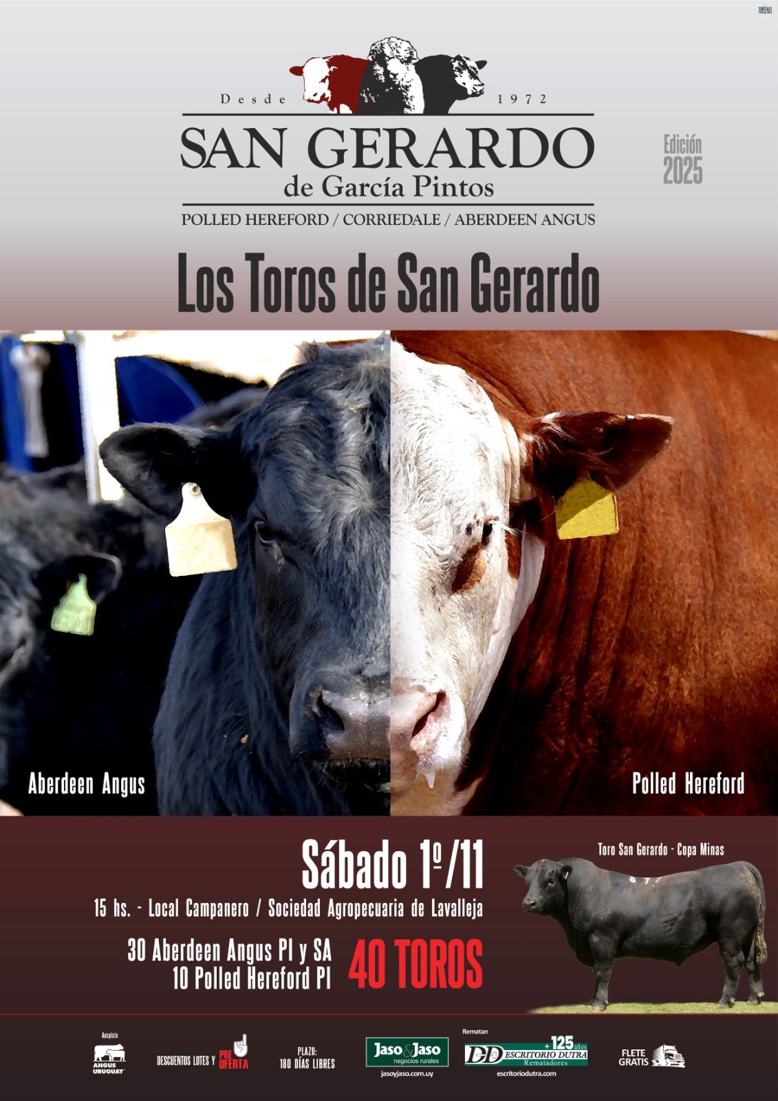 Este sábado la cabaña San Gerardo realizó la venta anual de sus toros Hereford y Aberdeen Angus, con ventas totales y muy buenos precios.El promedio general para los 40 toros comercializados fue de US$ 2.570, con los 25 toros Angus colocados a US$ 2.620 y los 15 Polled Hereford a US$ 2.490.